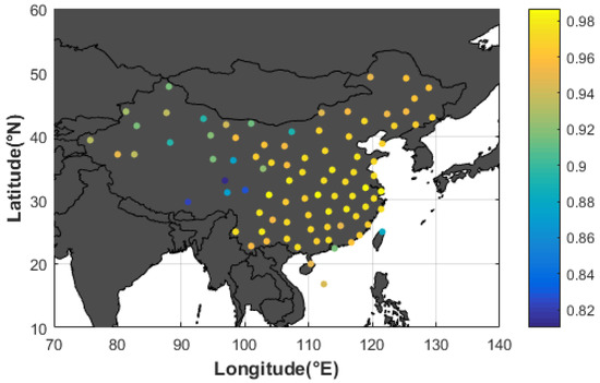 In Figure 5, there is a strong linear correlation between the RS-PWV and ERA5-ZTD time series, and the correlation coefficient of the two time series over the four stations is 0.950, 0.956, 0.972 and 0.974. For the other RS stations, Figure 6 shows the correlation coefficients of the RS-PWV and ERA5-ZTD time series over 89 RS stations.