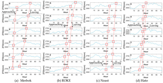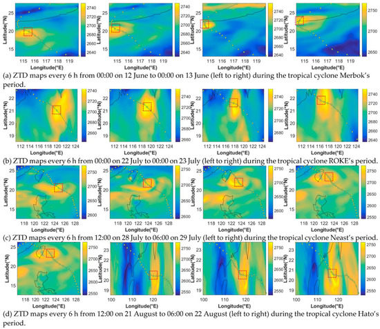 In Figure 7, the red dotted frame indicates the central area of the tropical cyclones, and the ZTD near the central area (red dotted frame) of the tropical cyclones is higher than the regions away from the central area. It also can be seen from Figure 7a–d that the moving direction of a yellow circle is the same as that of a tropical cyclone. The main reason is that due to a large amount of water vapor (an increase of ZWD) carried by a tropical cyclone, the ZTD over a region starts to increase and decrease when the tropical cyclone is approaching and leaving the region, respectively. As a result, a tropical cyclone has a yellow circle filled with ZTD along the route. The above results indicate that ZTD can be used to characterize the direction of a tropical cyclone’s movement, which is consistent with the previous results obtained by analyzing the path of a tropical cyclone’s movement by using PWV [27,28,29].