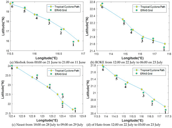 In Figure 8, 1 to 6 are the numbers of the ERA5 grids, and indicate the sequence in which the tropical cyclone passes. Then, the ZTD time series over the six ERA5 grids were obtained by using ERA5 datasets during the tropical cyclones’ periods. Figure 9 shows the time series with 1-h ZTD over the six ERA5 girds in Figure 8 during the four tropical cyclones’ periods.