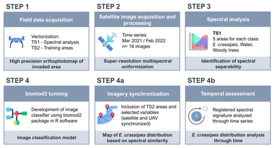 General workflow proposed for E. crassipes mapping with the methodology applied divided into sequential processing steps.
