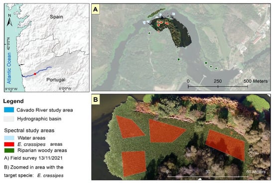 Located in the northern hemisphere of Northwestern (NW) Portugal, the study area has a temperate climate with dry and mild summers (Csb type, according to the Köppen and Geiger classification of climate systems) [37]. Characterized by the presence of discontinuous patches of E. crassipes, which throughout the summer (June to August) and autumn (September to November) have strong impact on riverine ecology and human activities, the study area extends from the Caniçada dam (41°39′N, 8°14′W) to the mouth of the Cávado River, covering a total of 60 km and an area of 548 ha (Figure 2). It is an elongated river with a transversal profile of narrow valleys (characteristic of a mountain river) progressing, after the Caniçada dam, from gradually opening valleys to flat valleys with higher levels of solar exposition and lower flow velocity due to the river’s meandering.