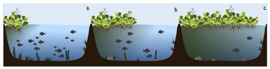 Illustration of E. crassipes invasion process. (a) establishment in a new area; (b) plant reproduction creates dense mats on the surface, blocking light and decreasing dissolved oxygen; (c) primary producers are affected, as well as trophic chains, promoting lifeless spaces.