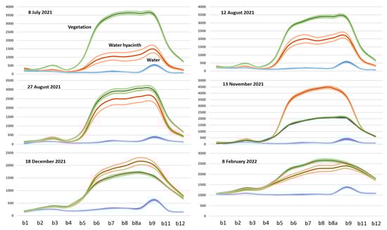 Spectrally, our results show that the spectrum between wavelengths 0.443 µm (band 1) and 0.665 µm (band 4) and at 2.190 µm (band 12) had a poor ability to distinguish E. crassipes from other riparian vegetation. During most of the year (except for moments when the growth or decay of the E. crassipes’ reflectance coincides with the one from riparian woody trees), the spectrum between 0.740–1.610 µm (band 5 to band 11) presented a higher spectral separability.