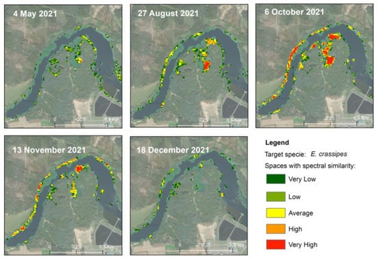 Although pixels with very low and low spectral proximity made up more than 50% of the information generated on most days tested, they followed a growth and decrease pattern identical to the classes with greater spectral proximity, being able to serve as proxies for the state of E. crassipes spread/growth. Pixels identified with very high spectral similarity had a maximum (>200 pixels) during September and October.