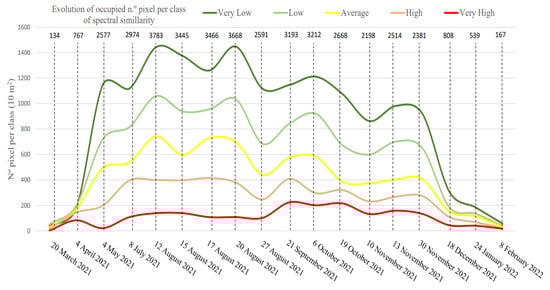 The number of pixels classified based on the spectral similarity to the one registered on 13 November was mapped and counted for the whole study area, and their evolution through the following months is shown in Figure 6. Each pixel represents an area of 100 m2, making it possible to estimate the total invaded area.
