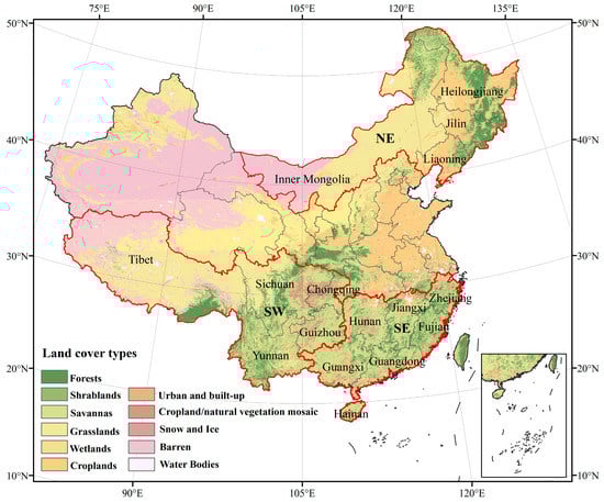 Land cover map of China in 2010 with the three study areas including the Northeast (NE) region, Southwest (SW) region, and Southeast (SE) region.