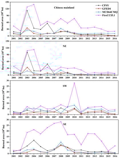 Figure 2 shows the spatial distributions of the total BA registered in the three products for the Chinese mainland from 2001 to 2016. It was obvious that the fire BA was mainly concentrated in the NE, SW, and SE regions in China. Specifically, it presented in the north of the NE region, the south of the SW region, and the central part of the SE region. Overall, GFED4 detected the least fire BA and FireCCI5.1 detected the most fire BA. Table 2 lists the total BA value for the Chinese mainland and its three main fire regions (i.e., NE, SW, and SE). The ratio of FireCCI5.1 to GFED4 varied from 8.57 for the SE region to 3.97 for the SW region.