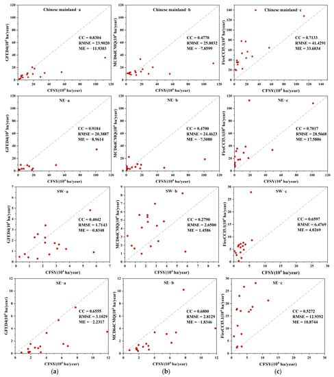 The scatter plots of monthly BA for the satellite products versus the CFSY are shown in Figure 6. For the Chinese mainland, the CCs for GFED4, MCD64CMQ, and FireCCI5.1 were 0.5815, 0.3618, and 0.5564, respectively, their RMSE values were 5.4227 × 104, 5.8516 × 104, and 8.5644 × 104 ha/month, respectively, and their ME values were 0.9942 × 104, 0.6550 × 104, and −2.8003 × 104 ha/month, respectively. For the three regions, the monthly RMSE for the NE, SW, and SE regions ranged from 5.2568 × 104 to 7.6352 × 104 ha/month, 0.3256 × 104 to 1.1608 × 104 ha/month, and 0.4793 × 104 to 2.5655 × 104 ha/month, respectively. The monthly CC for the NE, SW, and SE regions ranged from 0.2935 to 0.6178, 0.6384 to 0.7197, and 0.4925 to 0.7622, respectively. The results showed that the best performance occurred in the GFED4 estimate, which provided the lowest RMSE and highest CC in the Chinese mainland and the three subregions. Therefore, it can be concluded that the GFED4 estimate was optimal among the three satellite products at the monthly and annual scales.