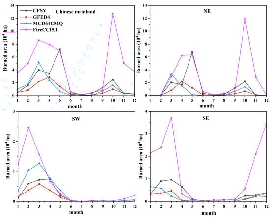 Figure 5 shows the variations in average monthly BA values for the four datasets in the Chinese mainland and three regions. Apparently, all products captured significant seasonal variations. Forest fires in the NE region mainly occurred in spring (MAM) and autumn (SON), while in southern China (SW and SE regions) they occurred mainly in spring (MAM) and winter (DJF). Moreover, the SE region in autumn was more prone to forest fires than the SW region. The results demonstrated three major aspects. First, the accuracies of the BA estimates decreased as the BA increased; second, the estimates of FireCCI5.1 were significantly high in some individual months, indicating the importance of evaluating the product’s detection capability during the fire season; third, the overall performance of GFED4 was better than that of MCD64CMQ, except for some months or seasons when MCD64CMQ slightly outperformed GFED4, such as April in the SW region and autumn (SON) in the NE region and Chinese mainland. In other words, GFFD4 had the best performance in spring (MAM) and winter (DJF). For summer, there was a smaller BA; therefore, the differences between the three products were small. Overall, GFED4 performed the best at the monthly and seasonal scales.