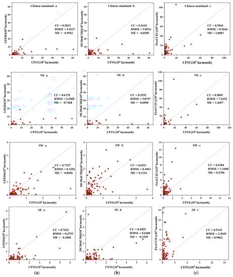 Scatter plots of monthly BA in Chinese mainland and the three subregions (NE, SW, and SE) for the CFSY versus the three satellite estimates: (a) GFED4, (b) MCD64CMQ, and (c) FireCCI5.1.