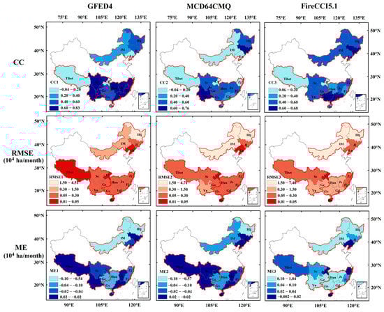 Overall, GFED4 had the best performance in RMSEs for all the provinces of the three regions, CCs for the provinces of the SW and SE regions, and MEs for the provinces of the SE region. For MEs, the number of provinces where GFED4 performance was slightly worse than MCD64CMQ was less than two. Therefore, it was concluded that GFEF4 showed better performance at the provincial and regional scales.