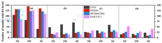 Two findings were obtained from the CFSY data in Figure 8. Firstly, the number of months with no fires and common fires was far higher than the numbers of months with severe and disaster fires. Secondly, the SE region had the highest number of months with fires. In terms of satellite product comparisons, all three products detected more no-fire months, which may have been related to the relatively rough spatial scale for satellite data, thereby limiting detection to the minimum fire area. Additionally, GFED4 had a more consistent number of months with the CFSY than the other products for fires in the NE region. FireCCI5.1 significantly overestimated the disaster fire BA (>1000 ha/month). Overall, all three products had stronger detection abilities for severe and disaster fires than for common fires.