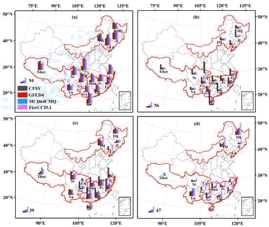 The severe fire BAs (Figure 9c) in the CFSY and the three products for each region were almost the same overall (e.g., Figure 8c), but significant differences existed at the province level. For instance, the NE regions presented overestimates in the Jl province and underestimates in the Ln province; the SW region presented overestimates in Tibet and underestimates in the Cq and Gz provinces; all provinces in the SE region presented underestimates, especially in the Zj province. For the disaster fire BAs (Figure 9d), the overestimate of FireCCI5.1 in the NE region mainly occurred in the Hlj and IM provinces. In the SE region, the performance of FireCCI5.1 in all of the provinces was slightly higher than that of the CFSY except in Gd province. For GFED4 and MCD64CMQ, their underestimates mainly occurred in the Gz and Sc provinces in the SW region and almost all provinces in the SE region except for the Gd province. There were no disaster fires in the Cq and Hn provinces.