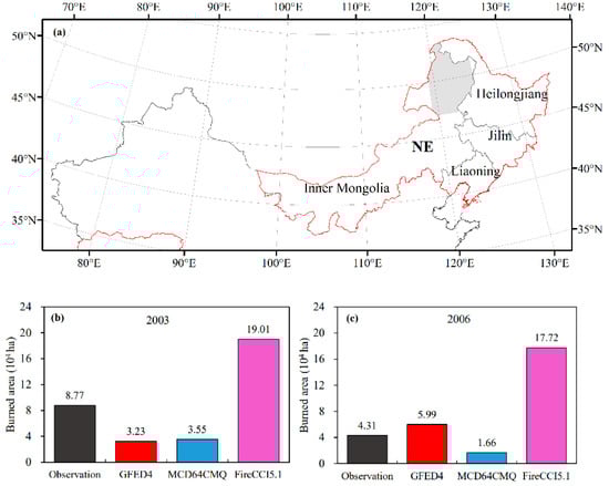 The BA comparison results of the three satellite products for 2003 and 2006 are shown in Figure 10b,c. In 2003, the forest BAs detected by GFED4, MCD64CMQ, and FireCCI5.1 were 3.23 × 104, 3.55 × 104, and 19.01 × 104 ha, respectively. Compared with the ground observation of 8.77 × 104 ha, the FireCCI5.1 estimate was significantly high, and those of GFED4 and MCD64CMQ were closer to the ground observations. In 2006, the forest BAs detected by GFED4, MCD64CMQ, and FireCCI5.1 were 5.99 × 104, 1.66 × 104, and 17.72 × 104 ha, respectively. Compared with the ground observations with 4.31 × 104 ha, it was clear that GFED4 was the closest to the ground observations. In total, GFED4 performed better than the other two products. The GFED4 estimate for the Chinese region was again proven to be reasonable. It was also demonstrated that the evaluation conclusions of the three products in the selected Chinese regions, based on the CFSY data, were reasonable and credible.