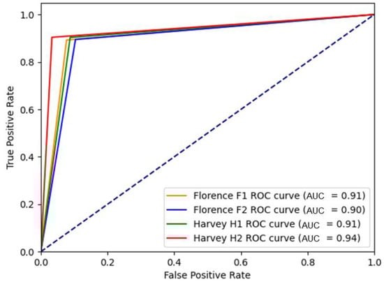 In addition to these commonly used evaluation indices for flood mapping, the receiver operating characteristic curve (ROC) and its corresponding area under the curve (AUC) were employed to assess the performance of the model [40]. The ROC curve was constructed by plotting the true positive rate (TP rate) on the Y-axis against the false positive rate (FP rate) on the X-axis. The AUC value, ranging from 0.5 to 1, served as a measure of the model’s performance, with higher values indicating better performance [38,41,42].