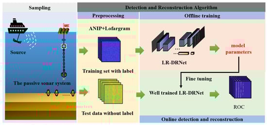 Thus, the spectral-line detection-and-reconstruction framework are proposed to solve Equation (1). As shown in Figure 1, the proposed framework, with the sampling, detection, and reconstruction algorithm, is illustrated. In the sampling stage, the passive SONAR system collects the acoustic signals and noises. The received data are preprocessed by AINP to construct the dataset. Subsequently, a specially designed LR-DRNet is pre-trained to obtain the optimal model parameters in offline training by adding into an adaptive weighted loss function based on dual classification. The well-trained LR-DRNet is utilized to fine-tune the parameters to detect and reconstruct the measured unlabeled samples in online detection and reconstruction. More details are described below:
