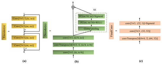 Structural diagram of each part in DRNet. (a) Structure of convolutional modules in Encoder (n). (b) Structure of the decoding layer. (c) Structure of the FinalConv layer.