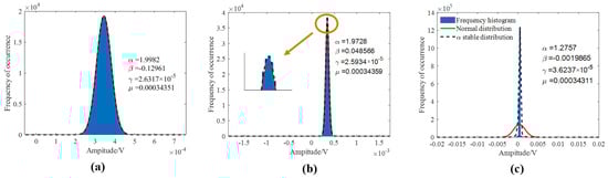 Comparison of the modeling of the normal distribution and -stable distribution under various disturbances. (a) In a quiet environment; (b) in a ship-interference environment; (c) under airgun interference.
