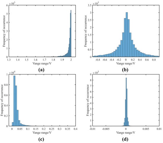 The underwater acoustic channel contains Gaussian and non-Gaussian impulse noises. Before establishing the dataset, the modeling and statistical analysis of the measured marine environmental noise were performed. We first modeled three typical marine ambient noises with normal and -stable distributions. Figure 4 shows that the -stable distribution is approximate to the marine ambient noise, particularly at high pulse intensities, which conforms with the results reported in []. Subsequently, the characteristic function method [] was applied to estimate the -stable distribution parameters and statistically acquire the parameter-distribution regularities. Figure 5 presents the statistical conclusions for the four parameters estimated by the -stable distribution. The is distributed between 1.7 and 2.0, indicating that the analyzed marine-ambient-noise data contain weak pulse characteristics. The is distributed at approximately 0, indicating that the SS distribution can model the noise. The values are relatively low, ranging from 0 to 0.01. The data amplitudes are relatively concentrated, which is consistent with the weak pulse characteristics. The is distributed at approximately 0, indicating that the measured noise data are concentrated around the zero value. Therefore, the simulation dataset was synthesized according to the distribution regularities of the parameters above and Equation (30).