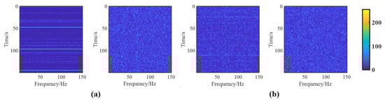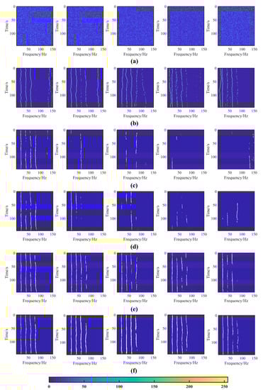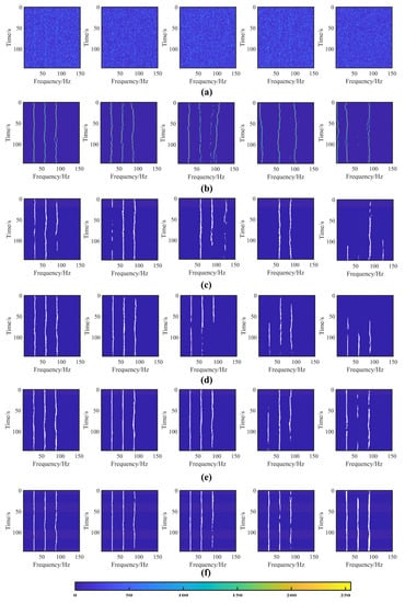 In the simulation of the SαS distribution noise, was randomly selected in the range of [1.3, 2], is set to 0, and , were set to 1 and 0, respectively. The fluctuating spectral lines within 100 Hz and MSNR in the range of [−26, −19] dB were considered. The sampling rate was 1000 Hz. Our synthetic dataset contained one to five fluctuating spectral lines, and multiple spectral lines had harmonic relations. The SαS distribution noise was added to the time-domain amplitude of sinusoids in the form of Equations (28) and (29) with the MSNR and SNR. Figure 6 presents the lofargrams of multiple sinusoidal signals of different MSNRs and lofargrams. The presence of spectral lines in lofargrams is not perceived through the visual senses below −22 dB. For MSNR in the range of −22 dB to −26 dB, we repeated the Monte Carlo simulation 1200 times to simulate the scenario under various parameters, splitting the dataset into 85% for training and 15% for testing. Therefore, our training datasets comprised 9600 lofargrams and 6800 lofargrams, while the test set had 1440 lofargrams and 1200 lofargrams.