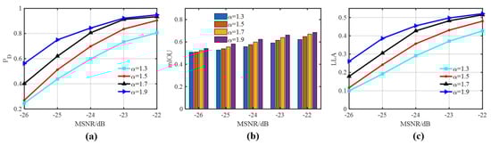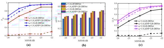 With AINP used as a preprocessor, the outcomes of the proposed AINP+LR-DRNet were compared under various values and MSNRs. As shown in Figure 11, the performance gradually decreased with decreases in alpha and MSNR, especially at = 1.3 and 1.5. The performances were comparable at high MSNR and values, presenting more advantages at lower MSNR and values. At an MSNR of −24 dB and an of 1.7, the proposed AINP+LR-DRNet still had a of approximately 78%, a mIOU of 0.59, and a LLA of 0.42. In particular, the stronger impulsive noise intensity and lower MSNR affected the feature-extraction ability of the network, encumbering the detection and reconstruction. Nevertheless, the proposed AINP+LR-DRNet is adaptable to low MSNR and strong impulse-noise intensity.