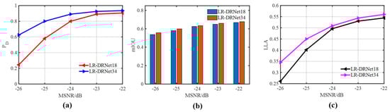 Specific tasks may require suitable network structures. The simulation analyzed the appropriate network structure for spectral-line detection and reconstruction. The two network structures chosen for this analysis were LR-DRNet18 and LR-DRNet34. As shown in Figure 9, the impact of LR-DRNet depth on performance varies across all MSNRs. Compared with LR-DRNet18, the deeper LR-DRNet exhibited comparable performances in the cases of −22 and −23 dB, and exhibited better performances with −24, −25, and −26 dB, respectively. This shows that increasing the network depth improves network performance. Therefore, the coding layer of the LR-DRNet was set to 34 layers.