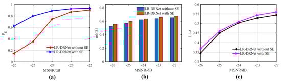 Performances of the AINP+LR-DRNet with and without SE in different MSNRs. (a) ROC; (b) mIOU; (c) LLA.