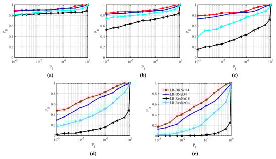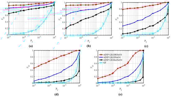 Finally, the detection performances of the GF, AINP+ResNet18, and AINP+DNet34 were compared to evaluate the proposed AINP+LR-DRNet. The was certain for a fixed test set. For a fair comparison, the GF was compared with the detection rate under the false alarm rate obtained by the proposed AINP+LR-DRNet.