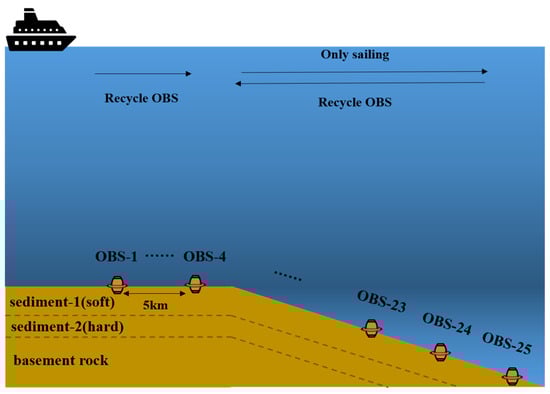 Another experiment conducted in the South China Sea in September 2021 was used to detect and reconstruct multiple spectral lines. An ocean-bottom seismometer (OBS) was deployed every 5 km, with a line length of more than 100 km. The entire seabed was initially relatively flat, and it gradually became inclined near the destination. The sampling rate of the OBS was 100 Hz. As shown in Figure 19, the ship sailed along a straight line at a certain speed for the deployment and recovery of the OBS. Therefore, the OBS can collect ship-noise samples at low SNRs, as well as marine-ambient-noise samples. The test data set was formed with 5000 more signal and noise samples from OBS-1 to OBS-25.