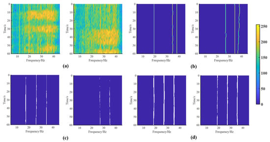 Lofargram reconstruction results of experimental data-1 by AINP+HMM, AINP+RNet34, and the proposed AINP+LR-DRNet, shown in (b–d), respectively. (a) Original lofargrams, which were not reconstructed.