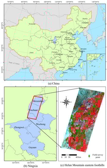 Location maps of the study area. (a) Map of China. (b) Map of Ningxia. (c) A false color image (859.68 nm for blue, 662.29 nm for green, and 559.23 nm for red) of ZY1-02D hyperspectral data for the EFHLM area, with the green diamond symbol representing the field survey points.