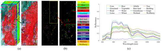 Land cover maps with refined categories are of prime importance for geographical conditions monitoring and can support many further applications such as precision agriculture [1,2], land resource management [3], environmental protection [4,5], and disaster assessment [6,7]. In recent years, remote sensing (RS) technology has become one of the most commonly used techniques for large-scale mapping due to its capability to obtain valuable spatial-spectral information over large areas quickly and cheaply. As one of the core technologies of RS, hyperspectral RS uses narrow and continuous spectral channels to continuously image ground objects and can obtain hundreds of bands and rich spectral information about ground objects. Thus, hyperspectral images (HSIs) can classify more detailed ground object categories, especially vegetation categories, which makes a significant contribution to land cover identification tasks [8] and precision agriculture [9]. Moreover, the emergence of various available hyperspectral datasets and the vigorous development of intelligent algorithms in recent years have made it possible to perform large-scale and high-precision fine land cover mapping based on HSIs.