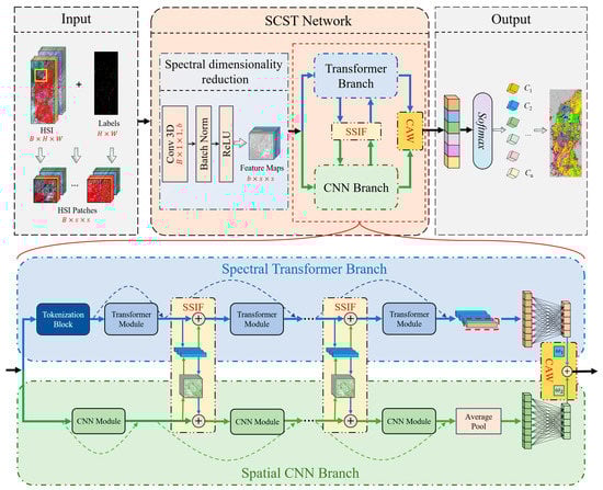 The overall pipeline of the proposed SCSTIN framework used for HSI classification is shown in Figure 3. SCSTIN is an end-to-end patch-wise classification method, which features a spectral dimensionality reduction block, a spectral Transformer branch, a spatial CNN branch, SSIF modules, and a CAW module. Incomplete feature extraction, inappropriate feature fusion, and longtime consumption are the major challenges for the CNN models to be applied in the classification of large-scale satellite hyperspectral images. These problems are addressed to some extent in the proposed SCSTIN framework.