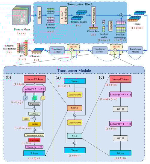 As shown in the upper part of Figure 4, for the input feature maps , the 2D spatial information map of size is flattened into a 1D feature vector with the size of . The flattened vectors are then fed into a linear embedding process, which encodes the spatial information of each spectral feature band into the feature representation of the corresponding band, called the spectral token in our net. The spectral tokens have the size , where is the embedding dimension. Subsequently, a prepended class token with the dimension size of , which is a randomly generated learnable vector, is concatenated with the spectral tokens to construct size tokens. Importantly, in order to supplement the sequence position information between tokens, the element-wise sum is conducted between current tokens and position embeddings with size. The position embeddings are expanded from the learnable size position vector. Finally, the tokens are the output. In summary, the whole process for the tokenization block is formulated as follows: