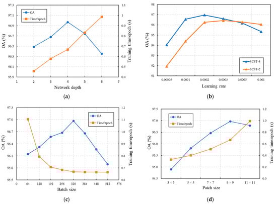 Batch training is a key algorithm for deep learning. It can address multi-input data in parallel to reduce training time and accelerate network convergence. Too small a batch size will lead to a longer running time, while too large will reduce the generalization performance of the model [52]. In order to select the appropriate batch size, we take the SCSTIN-4 model as an example to compare the classification accuracy and efficiency on the EFHLM dataset. Figure 7c shows the performance of SCSTIN-4 with different batch sizes ranging from 64 to 512. For classification accuracy, it is obvious that overall accuracy (OA) reached its highest value when the batch size was 320. While average training time per epoch decreased as batch size increased, the reduction was negligible after 320 batch size. Thus, 320 was chosen as the compromise batch size.