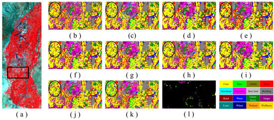 Furthermore, the spatial distribution pattern of the ground objects in the EFHLM is analyzed based on the SCSTIN-4 classification map. Combined with the false color image of EFHLM and classification map of SCSTIN-4 (a) and (k) in Figure 9, it can be seen that the Helan Mountains are in the upper left corner of the imagery. The Helan Mountains are stony mountains with barren land, many bare rocks, and low vegetation coverage, so only a few trees are distributed in the mountains. EFHLM is located in the upper reaches of the Yellow River, which can be seen running through the imagery from right to bottom. The three cities distributed vertically on the map correspond to Shizuishan City, Yinchuan City, and Wuzhong City in Figure 1b from top to bottom. Importantly, due to suitable geographical and climatic conditions, the EFHLM area is mainly covered by a variety of vegetation. Corn and rice are the main food crops in this area; corn is distributed throughout the region, while rice is found near rivers and lakes due to the need for water. Wetlands are distributed along the Yellow River, including a number of national wetland parks. Alfalfa is planted in a large field in the upper right corner of the imagery. Greenhouses are mainly distributed near Yinchuan City, while vegetables are mostly planted between Yinchuan City and Wuzhong City. Lastly, it is of great significance to study the grape distribution of EFHLM, which is the “golden zone” of grape cultivation. To be more intuitive, the main planting areas of grapes are framed with purple boxes in Figure 9a,k. The two boxes near the imagery edge are mainly open-air grape fields planted in large areas, which is consistent with the study result of Liu et al. [58]. As for the other purple box, it can be seen that this area is close to the town of Yinchuan City. After the on-the-spot investigation, it was found that the grapes in this box were mainly planted on several wine estates.