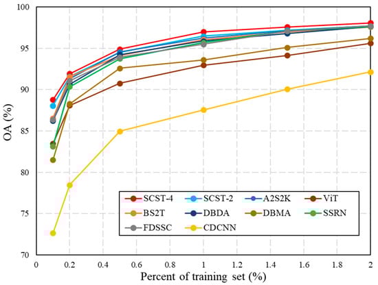 The deep learning models perform ground object classification by mining the higher-level spatial-spectral features of HSI in a data-driven way. Thus, the quality of the models is determined by the number of samples involved in parameter training, and the appropriate number of training samples can also save time and manpower without losing classification accuracy. Therefore, we compare the classification performance of different models over different numbers of training samples, as shown in Figure 10. The training sets were set at 0.1%, 0.2%, 0.5%, 1%, 1.5%, and 2%, respectively. It is obvious that the three basic models (i.e., CDCNN, DBMA, and ViT) have relatively poor performance, while the other algorithms have improved the classification accuracy in all percentages of training samples through certain improvements. With a more reasonable hybrid structure between CNN and Transformer, the proposed SCSTIN models perform better in OA. When the percentage is small, the SCSTIN models show significant advantages over other comparison models. For example, when the training set is set to 0.1%, the OA of both SCSTIN-4 and SCSTIN-2 is greater than 88%, far exceeding the OA of other comparison models. As the percentage of training samples increases, the improvement gap between the models narrows. When the percentage of training sets is large, the proposed SCSTIN-4 model still shows competitive results. However, the SCSTIN-2 gradually caught up with other comparison models due to its shallow feature extraction layer. In addition, it is worth noting that the OA of all models is not significantly improved when the percentage of the training set is greater than 1%, so the 1% training set is the most appropriate for the EFHLM dataset. In summary, the proposed SCSTIN models show more significant improvement under limited training samples, and the SCSTIN-4 model is in a leading position under each training sample percentage.