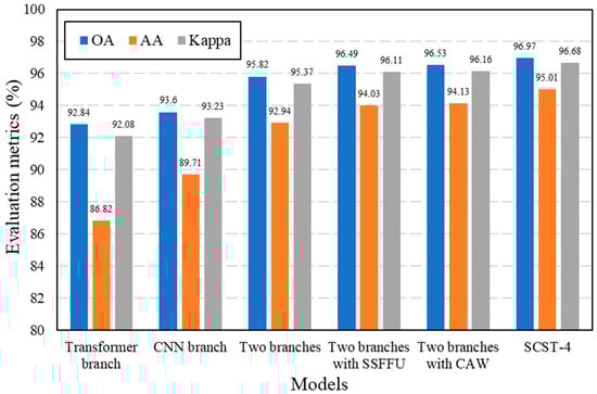 The extraction and fusion of spatial and spectral features play an important role in the HSI classification based on the deep learning method. In the proposed SCSTIN framework, two branches and two fusion modules were conducted to mine and integrate spatial-spectral features, respectively. To validate the effectiveness of each part of the SCSTIN model, we take SCSTIN-4 as an example to perform ablation experiments on the EFHLM dataset under the case of 1% training samples. Figure 11 exhibits the results of the ablation study conducted with each module of the SCSTIN model. From the results, it can be observed that the classification accuracy of the two-branched network exceeds that of any single branch, which proves the effectiveness of combining the 2D spatial features and spectral sequence features extracted by CNN and Transformer. Applying any feature fusion module in the model also results in a significant improvement in classification results, which proves that the organic fusion of the two features can also enhance the performance of the model. Furthermore, the SCSTIN-4 model with all four modules achieves the highest accuracy in the EFHLM dataset. In conclusion, the adopted two branches and two feature fusion modules in the SCSTIN-4 model can significantly improve the classification accuracy in the EFHLM dataset, indicating that all modules in the proposed method are effective.