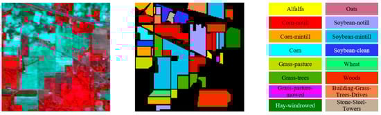The Indiana Pines dataset was captured in northwestern Indiana by the AVIRIS sensor equipped on an airborne platform. It is composed of 145 × 145 pixels and 200 spectral bands covering 400–2500 nm after removal of water vapor absorption bands. Figure 13 exhibits the false color image and ground truth distribution of the airborne hyperspectral dataset for Indiana Pines, which contains a total of 16 classes of ground objects.