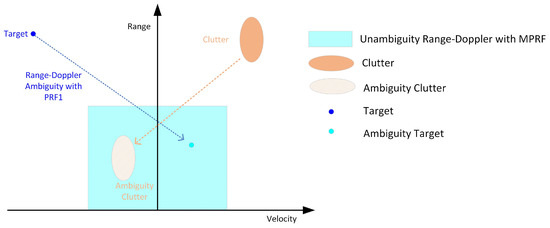 As radar typically transmits fixed PRF signals, target and ground clutter echoes will suffer from range ambiguity and velocity ambiguity in the received echoes, as shown in Figure 2. For a given PRF, the maximum unambiguous range of the radar can be denoted as , and the maximum unambiguous velocity as .