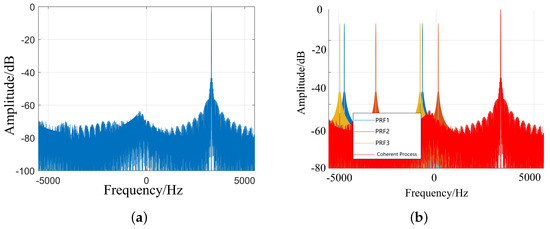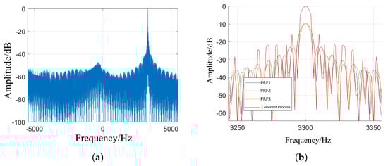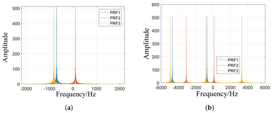 As shown in Figure 7b, in the range of Doppler frequency, due to the existence of Doppler ambiguity, there is a period extension under different PRFs. Only at the frequency of 3300 Hz, the DFT results of the three PRFs coincide.