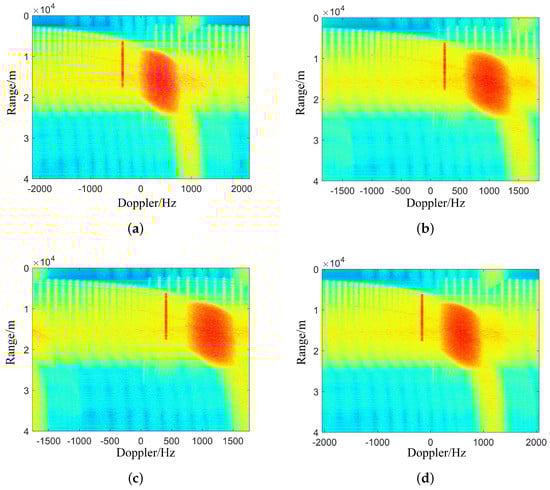 The DFT results of the radar echo signal. (a) Results of RD for the PRF1 signal group. (b) Results of RD for the PRF3 signal group. (c) Results of RD for the PRF4 signal group. (d) Results of RD for the PRF5 signal group.