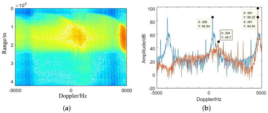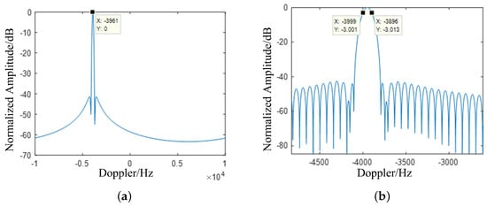 In the figure, the correct Doppler spectrum for the target and the clutter area (around 4900 Hz) exhibits significant energy, while the remaining ambiguous areas contain only residual energy. For a clearer analysis of the coherent effect and ambiguity suppression performance, the signal from the range bin containing the target is examined. Figure 13b presents the Doppler spectrum of the target’s range bin. In the figure, the target’s Doppler is accurately resolved and its coherent accumulation achieves an energy gain of 13.38 dB, close to the theoretical value of 13.97 dB. In non-target areas, there is residual energy from Doppler ambiguity resolution, resulting in energy distribution in some regions. The energy of ambiguity resolution is suppressed by approximately 50 dB.