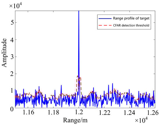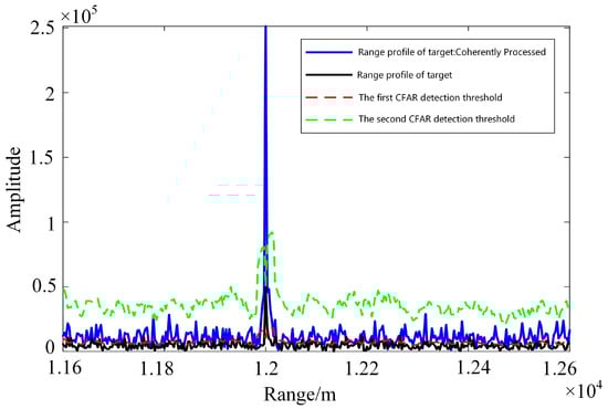 The experiments above confirm the accuracy of Doppler ambiguity and the coherent gain of target energy. In practical applications, performing coherent processing of ambiguity resolution on every range-Doppler cell within the power range requires extensive computation. To reduce the computational load, first-layer detection of the echo signal can be employed. Firstly, the RD results of each PRF signal group are detected using a lower first detection threshold (7 dB). Figure 14 illustrates the schematic diagram of CFAR detection. Then, based on the detection results, Doppler ambiguity resolution and coherent fusion are performed, followed by a second-layer detection on the fusion results.