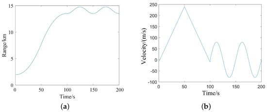 In the simulation, a target within the radar field of view starts moving away from the radar at a distance of 2 km, accelerates, decelerates, and hovers over the ground. The target’s trajectory within 200 s is simulated, and target detection is performed in clutter. The speed and distance of the target during the simulation time period are shown in Figure 19.