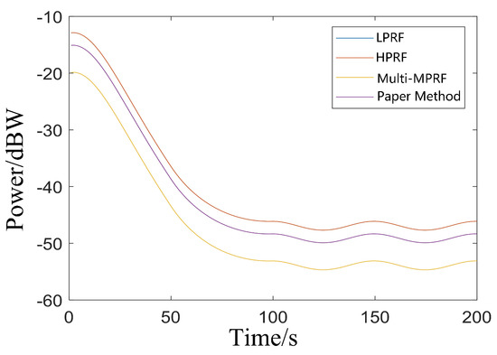 To ensure an equivalent comparison, the radar is configured with the same transmission energy during each dwell time, resulting in a fixed average transmission power. Under LPRF, the pulse signal exhibits high instantaneous power, while HPRF demonstrates low instantaneous power. After coherent processing, the echo power is calculated for each PRF. LPRF and HPRF maintain full coherence throughout the dwell time, resulting in equal echo power for the target. In the case of traditional multi-group MPRF, five groups of MPRF signals are used, and each group is separately detected, resulting in coherent performance of only 1/5 of the total energy. The method proposed in this paper uses three groups of signals in five groups for coherent accumulation detection, resulting in coherent processing performance equivalent to 3/5 of the total energy.