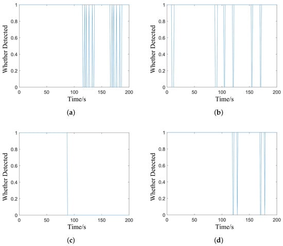 During the simulation process, the received echo’s noise power is set to −64 dBw. The detection results of the target at different PRFs throughout the entire track are depicted in Figure 21.