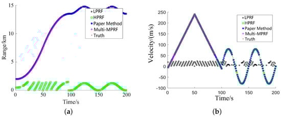 Figure 22 illustrates that LPRF, Multi-MPRF, and the proposed method accurately extract target distance, whereas HPRF suffers from severe distance ambiguity and cannot accurately reflect the true target distance. In terms of target speed estimation, HPRF, Multi-MPRF, and the proposed method provide accurate results, while LPRF exhibits speed ambiguity within the detectable range. The proposed method employs a range-speed ambiguity resolution technique similar to traditional Multi-MPRF, enabling simultaneous and accurate estimation of target distance and speed. Additionally, by utilizing at least three groups of signals for coherent processing within five groups, the proposed method achieves a three-times increase in SNR gain, expanding the theoretical power range of the radar by 1.48 times compared to traditional Multi-MPRF.