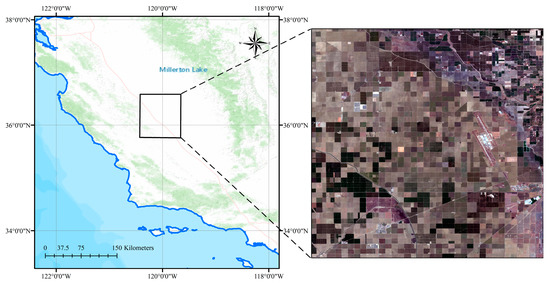 The test area selected for this experiment is located in California, United States, as shown in Figure 5. California, located on the west coast of the United States, has a population of approximately 39.5 million and a geographic area of approximately 414,000 square kilometers, making it the third-largest state in the USA. Due to its proximity to the Sierra Nevada Mountains and its location along the Pacific Ocean, the Central Valley has abundant water and thermal resources, providing excellent growing conditions for economically important crops such as fruits and vegetables. This has made California one of the most important agricultural states in the USA. According to official US statistics, the major crops planted in California in 2022 include almonds, walnuts, grapes, tomatoes, and winter wheat [37]. Within this state, we selected an area of interest, a 40 × 40 km crop plantation area in Fresno County. This plot is mainly used for growing economically important crops such as cotton, winter wheat, alfalfa, tomatoes, and grapes, and its corresponding crop calendar is described in Appendix A.
