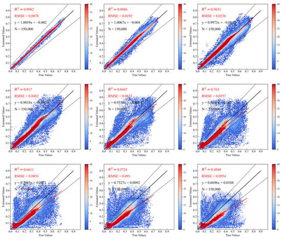 Scatter plot results of partial NDVI prediction and actual data. A total of 150,000 representative pixels were randomly selected from the predicted image and the corresponding real image to calculate their R2, average RMSE, and fitting function relationship. The time range corresponds to that in Figure 7.